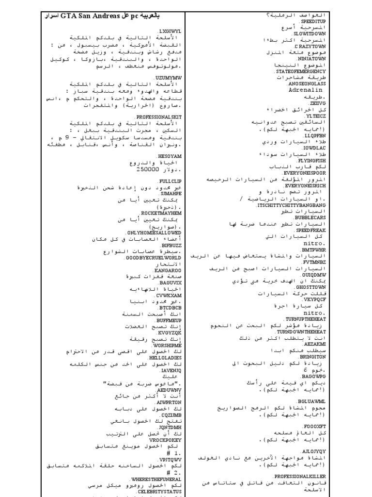 Kazyoo vous propose une liste de cheat codes et astuces pour grand theft auto gta sanandreas sur psen arabe. Les codes pc tout les codes pc pour gta san andreas. Codes pc page actuelle. هده بعض اكواد لعبة gta san andreas و التي تتم كتابتها اتناء اللعب kjkszpj.