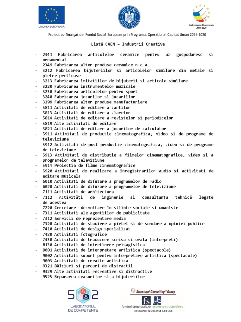 Lista codurilor caen rev. Productie industrie prelucratoare industrii creative. Nomenclator cod caen 2020 pe intelesul tuturor. Publicitatea arhitectura arta meșteșugurile design ul moda filmul muzica artele scenei editarea publishing cercetarea.