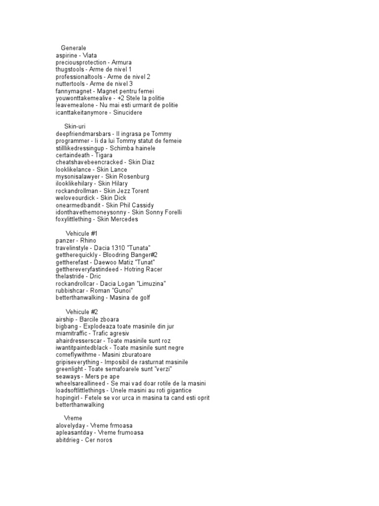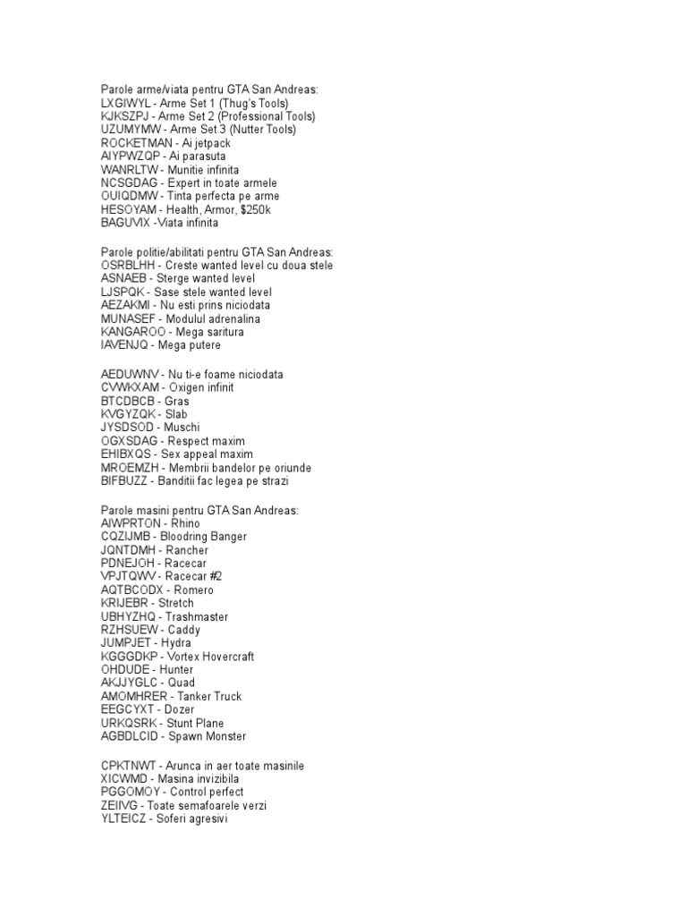 Cele care sunt cuvinte si cele care se asemuiesc limbajului bebelusilor. Lista completa cu toate parolele din gta san andreas o gasiti mai jos aceasta cuprinde si parolele noi toate fiind grupate pe categorii in functie de efect ca sa va fi mai usor de cautat. Probabil ca sa troll eze jucatorii cheat uri cu functii asemanatoare sunt scrise ba intr un fel ba intr altul. Un prieten m a tras de urechi că nu am pus si codurile de la gta.