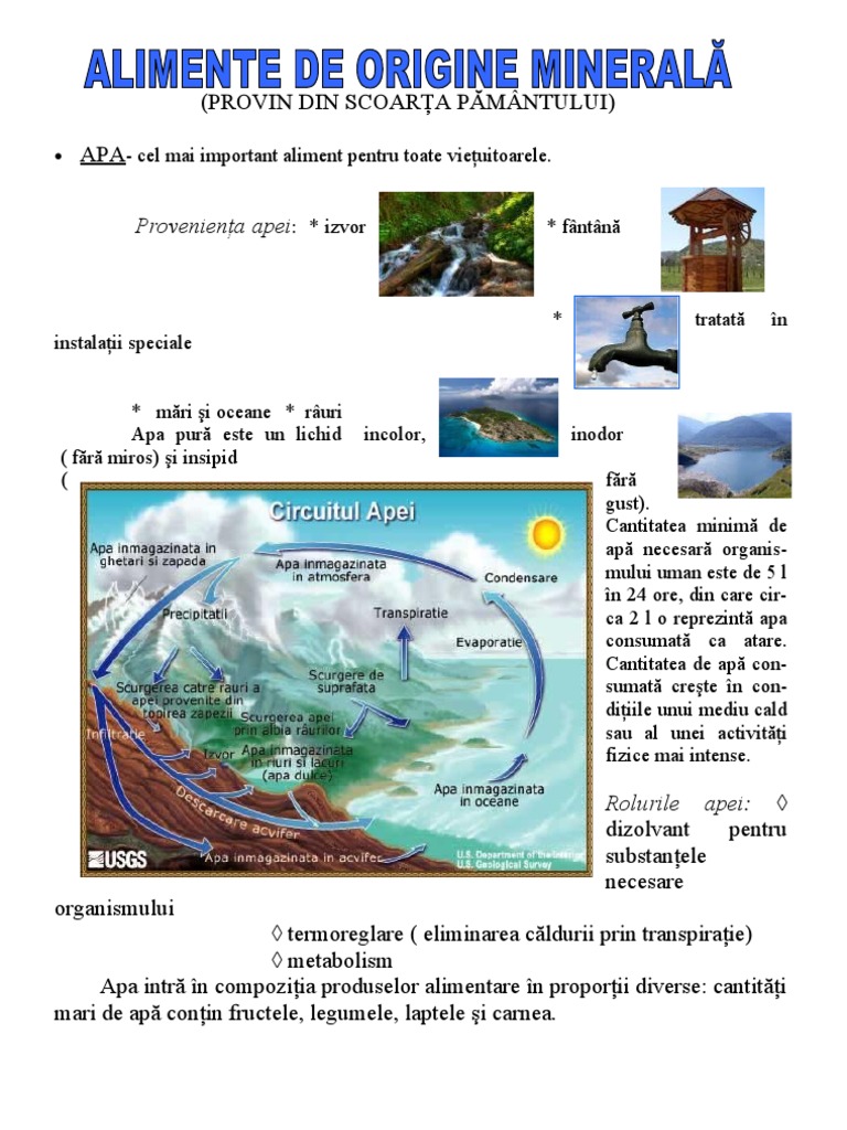 Alimente de origine minerala. Testul este de nivel mediu venind in ajutorul elevilor. Apa reprezintă cel cel mai important aliment fără de care oamenii şi celelalte vieţuitoare nu pot trăi. Alimentele de origine minerală.