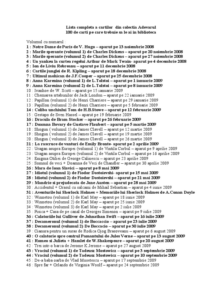 Colectia de carti adevarul lista. 0 produse 0 00 lei anticariat online vânzare cărţi vechi şi noi. Colectia completa adevărul 100 de diverşi autori. O lista cu toate cartile sau cu jumate macar ar fi bine venita. Lot 60 carti colectia adevarul 100 de opere esentiale.