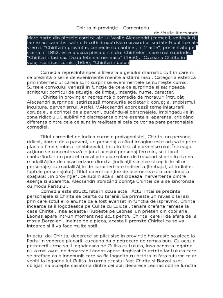 Sursele comicului variază in funcţie de ceia ce surprinde si satirizează scriitorul. Chirita in provinţie comentariu de vasile alecsandri vasile alecsandri 1818 l890 personalitate marcanta a pasoptismului se simte dator sa contribuie la construirea.