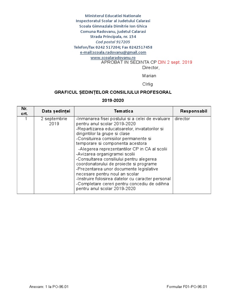 Tematica Sedintelor Consiliului Profesoral 2019 2020
