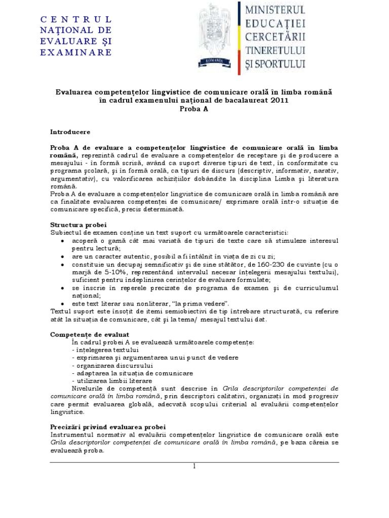 Este vorba de evaluare a competențelor lingvistice de comunicare în limba română proba a. Proba a de evaluare a competenńelor lingvistice de comunicare orală în limba română are ca finalitate evaluarea competenńei de comunicare exprimare orală într o situańie de. Variantele modelele de subiecte precum și baremele de. Absolventii de liceu dau proba scrisa la limba si literatura romana un numar de 136 871 de absolventi de liceu s au inscris pentru a sustine probele scrise ale primei sesiuni a examenului de bacalaureat care va incepe luni cu testul la limba si literatura romana.
