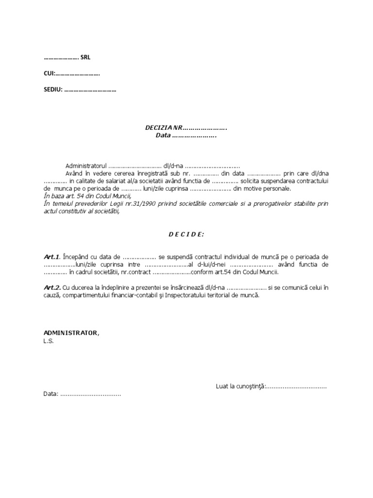 Concediu fara plata 2019. Potrivit articolului 153 din codului muncii pentru rezolvarea unor situatii personale salariatii au dreptul la concedii fara plata. Pe durata concediului fără plată pentru motive personale contractul de muncă este suspendat astfel că toate drepturile ce decurg din acesta vor fi suspendate. 153 din codul muncii republicat in. 153 din codul muncii si poate fi acordat pentru rezolvarea unor situatii personale.