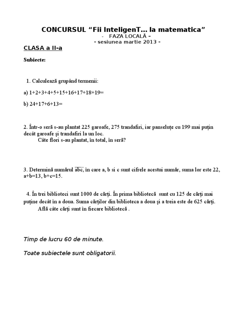 Matematica și explorarea mediului clasa i semestrul 2 15 00 lei 9 75 lei. Niciun material disponibil în această zonă. Concurs fără finanţare mects. Subiecte date clasa a ii a fii inteligent la matematica 2014.