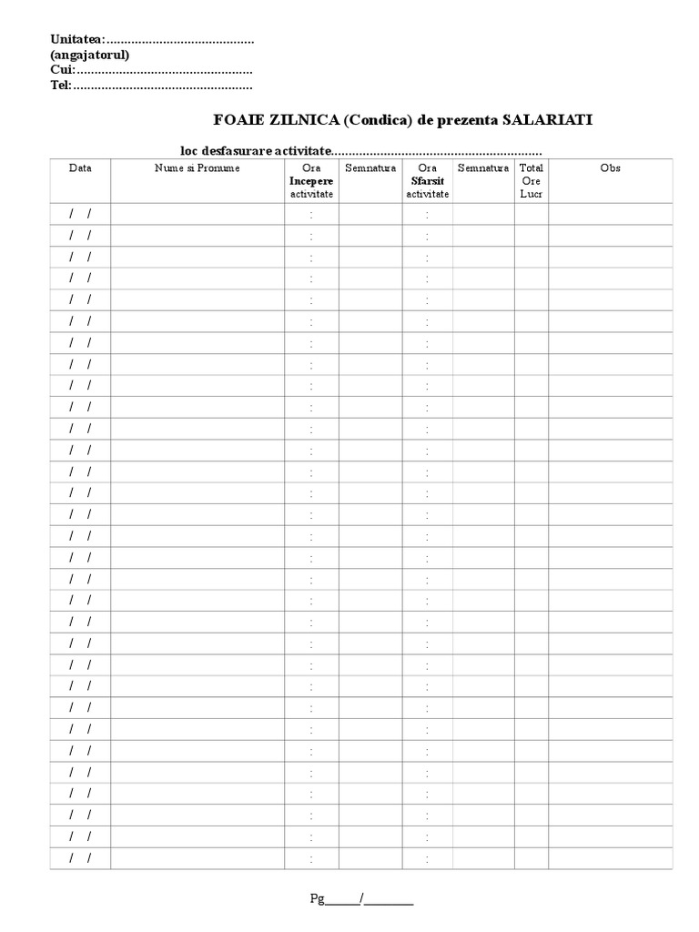 Condica de prezenta 2020 pdf. Condica de prezenta privind ora de sosire la munca si ora de plecare de la munca pentru fiecare salariat poate fi tinuta atat pe suport de hartie cat si electronic pentru persoanele care au acces la locul de munca pe baza unui card sau inregistreaza intervalul in care presteaza efectiv activitatea in orice alt mod. Modificările documentului sunt esențiale pentru că de la data respectivă condica de prezență se completează doar. In partea de jos a paginii vei gasi gratuit un model de condica de prezenta necompletat disponibil pentru descarcare in format editabil word sau pdf. Condica de prezenta sau fisa de pontaj zilnica este un document care este obligatoriu pentru societatile comerciale si are rolul de a tine o evidenta a angajatilor privind orele de munca lucrate.