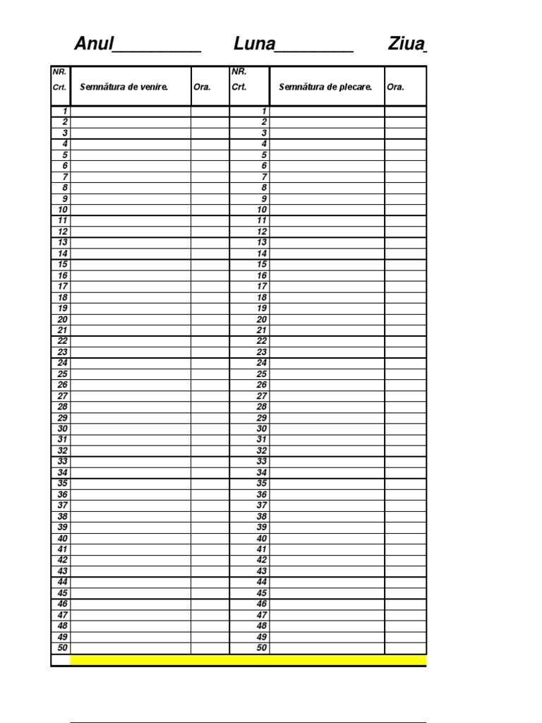Condica de prezenta sau fisa de pontaj zilnica este un document care este obligatoriu pentru societatile comerciale si are rolul de a tine o evidenta a angajatilor privind orele de munca lucrate. Numele si prenumele semnatura observatii 1 2 3 4 5 6 7 8 9 10 11. Codul muncii obligă angajatorul prin prevederile articolului 119 să țină evidența zilnică a orelor de intrare și ieșire ale salariaților angajatorul are obligația de a ține la locul de muncă evidența orelor de muncă prestate zilnic de fiecare salariat cu evidențierea orei de începere și a celei de sfârșit al programului de lucru. Secţia de ştiinţa şi tehnologia informaţiei institutul de cercetari pentru inteligenta artificiala icia compartiment secretariat procedura operaţională privind condica de prezenţă efectuarea concediilor de odihnă a concediilor fără salariu a altor tipuri de concedii şi ỉnvoiri ediţia.