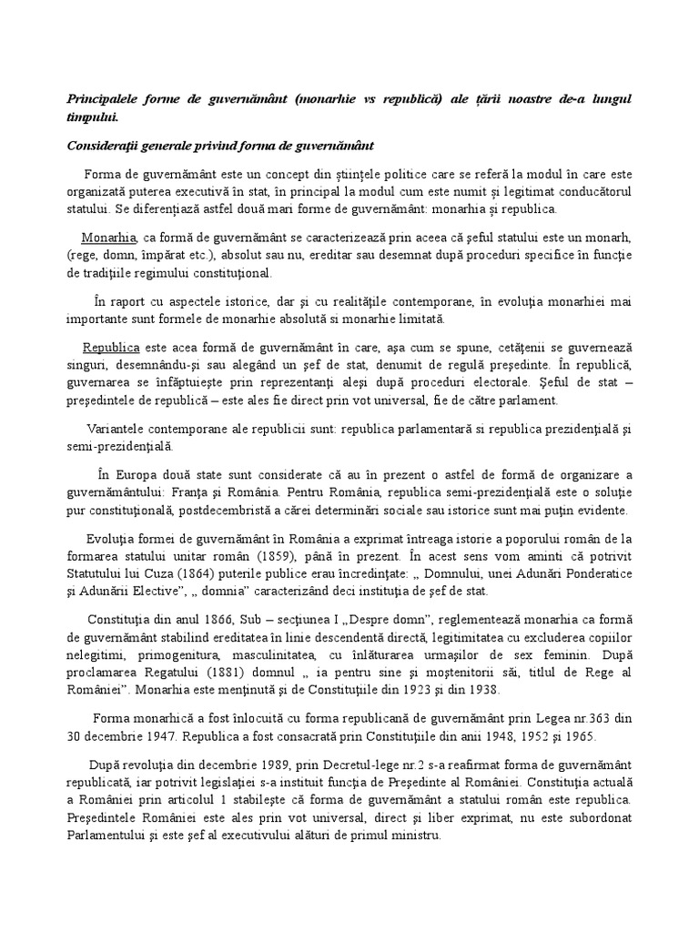 Principalele Forme De Guvernămant Monarhie Vs Republică Ale țării Noastre De A Lungul Timpului Consideraţii Generale Privind Forma De Guvernămant