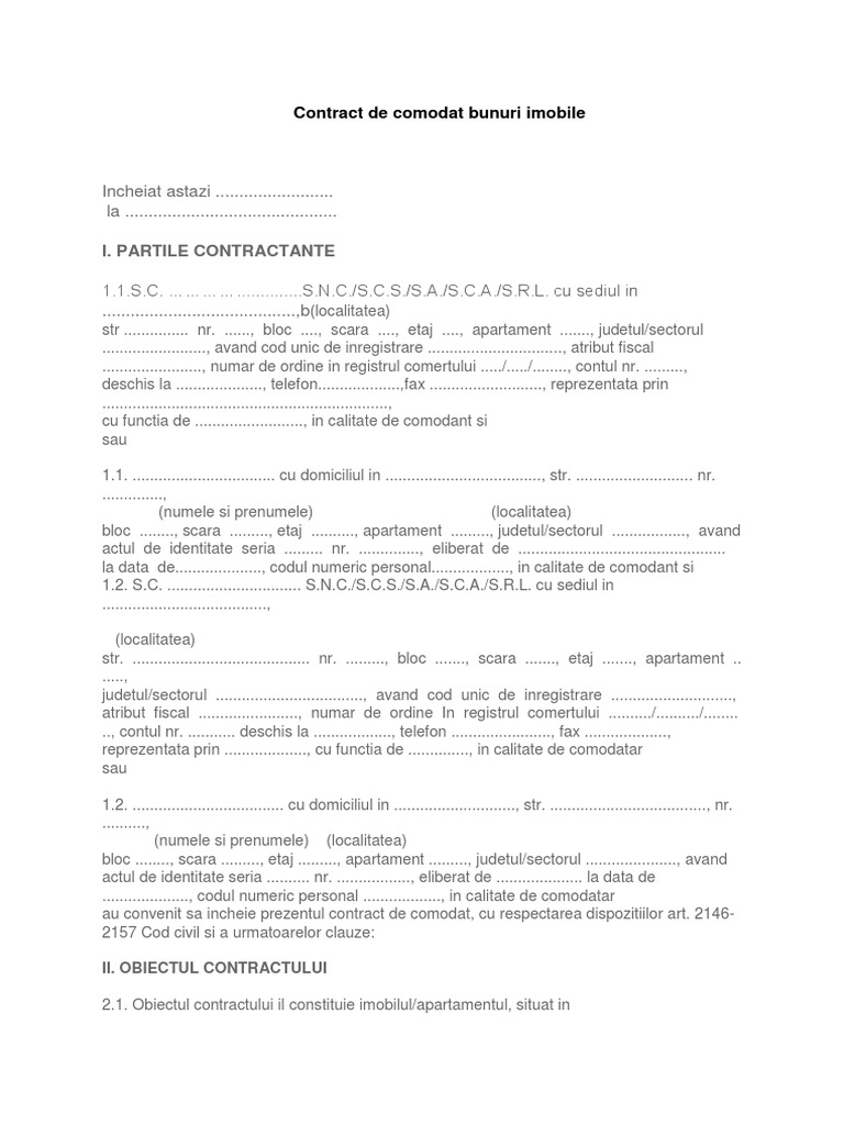 Contractul de comodat se încheie pentru dobândirea dreptului de folosinţă asupra sediului social sau a unui punct de lucru pentru pfa uri sau societăţi comerciale. La încheierea unui contract de comodat este important ca părţile să fie identificate cu exactitate ca acestea să fie proprietarii tabulari ai imobilului iar obiectul contractului să. Prezentul contract împreună cu anexele sale care fac parte integrantă din cuprinsul său reprezintă voința părților și înlătură orice altă înțelegere verbală dintre acestea anterioară sau ulterioară încheierii lui. Popescu ion legitimat cu.