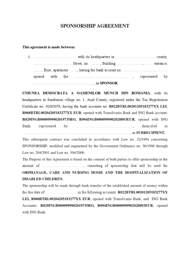 Sponsorul este obligat să ducă la îndeplinire întocmai cum au fost detaliate activitățile de sponsorizare prevăzute la art. Din data 1. 6 2 37 votes. Dispoziții finale prezentul contract reprezintă voința părților și înlătură orice altă înțelegere verbală dintre.