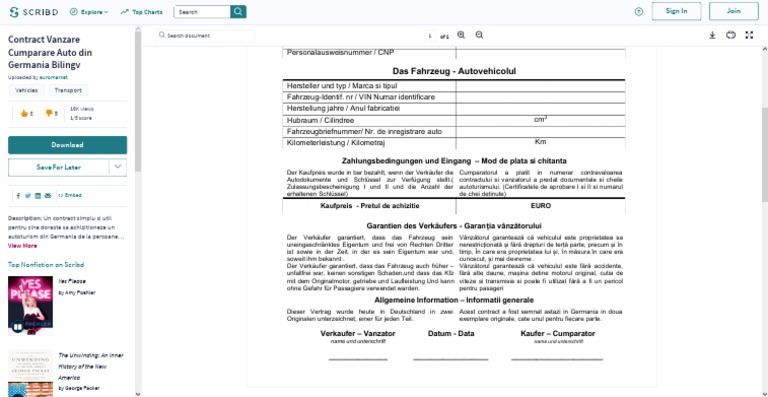 Un contract simplu si util pentru cine doreste sa achizitioneze un autoturism second hand din germania de la persoane private pkv asa isi spun la persoanele fizice dar si la turisme. Contract vanzare cumparare auto din germania bilingv. Fahrzeug kaufertrag contract de vanzare cumparare autovehicol verkaufer vanzator name und vorname nume si prenume strasse adresa ort stadt und land oras tara geburtsdatum data nasterii personalausweisnummer cnp.