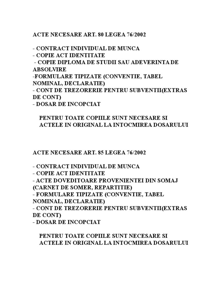 Incadrarea conf art 85 din legea nr 76 2002 acte necesare la dosarul pentru conventie.