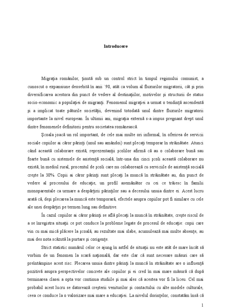 Arhiva contine 1 fisier doc de 85 de pagini. Numarul total al copiilor din romania care aveau ambii parintii plecati la munca in strainatate era la finele primului semestru al acestui an de 18 403 in timp ce totalul copiilor cu parinti plecati la munca in strainatate era de 96 723 conform datelor centralizate de autoritatea nationala. Peste 18 000 de copii au ambii parinti plecati la munca in strainatate. Managementul de caz în lucrul cu familiile de origine 15 ii 1.